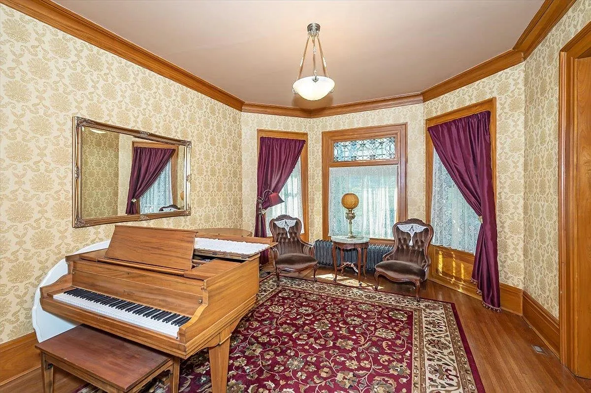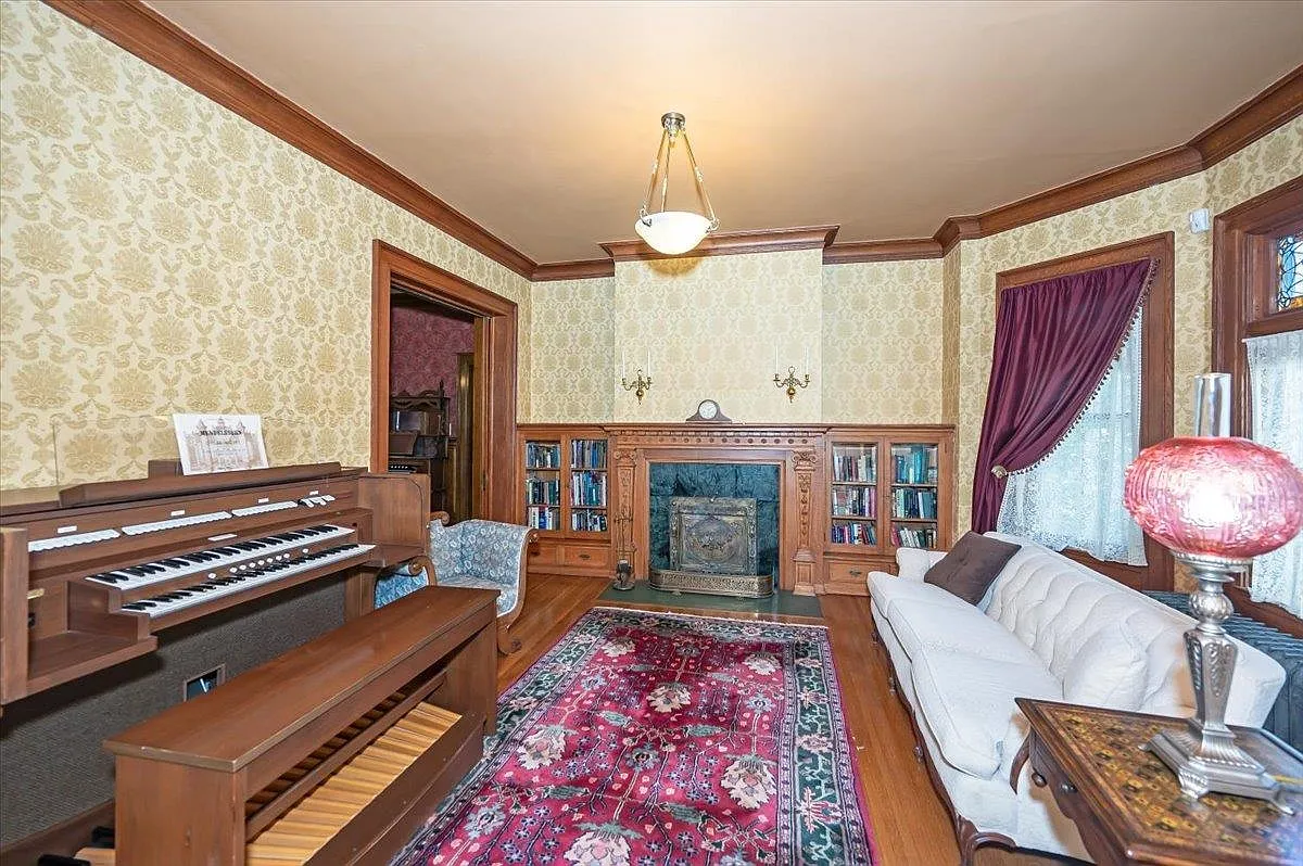 From the instant you step through the front door, you are welcomed by a magnificent foyer that sets the tone for the rest of the home. The space showcases hand-carved woodwork, intricate oak trim, and period-appropriate design elements that immediately transport you to the early 20th century.