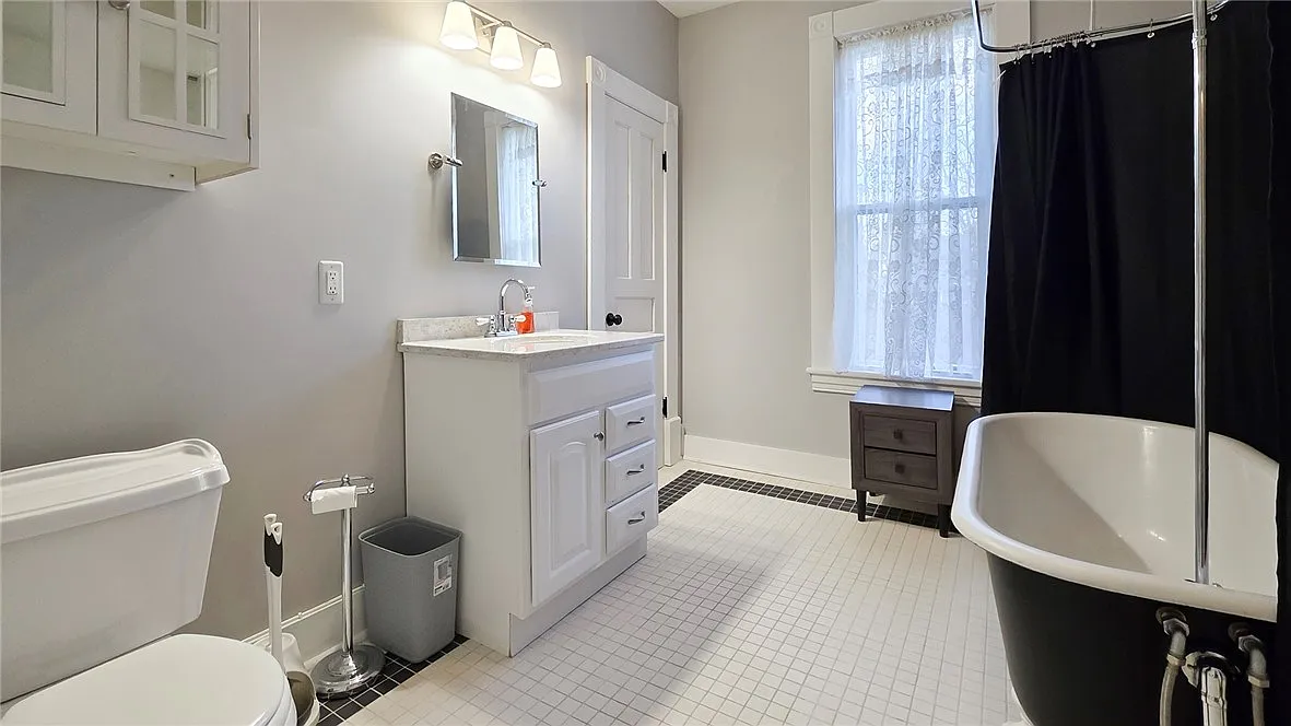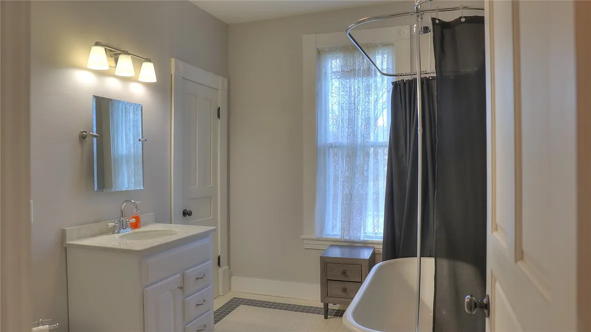 The second bedroom is equally inviting and is located adjacent to its own full bathroom, making it ideal for family members or guests. Both bathrooms are rich with character, showcasing claw foot tubs and ceramic tile flooring that perfectly align with the home’s Victorian style. These spaces feel luxurious, nostalgic, and thoughtfully preserved.
