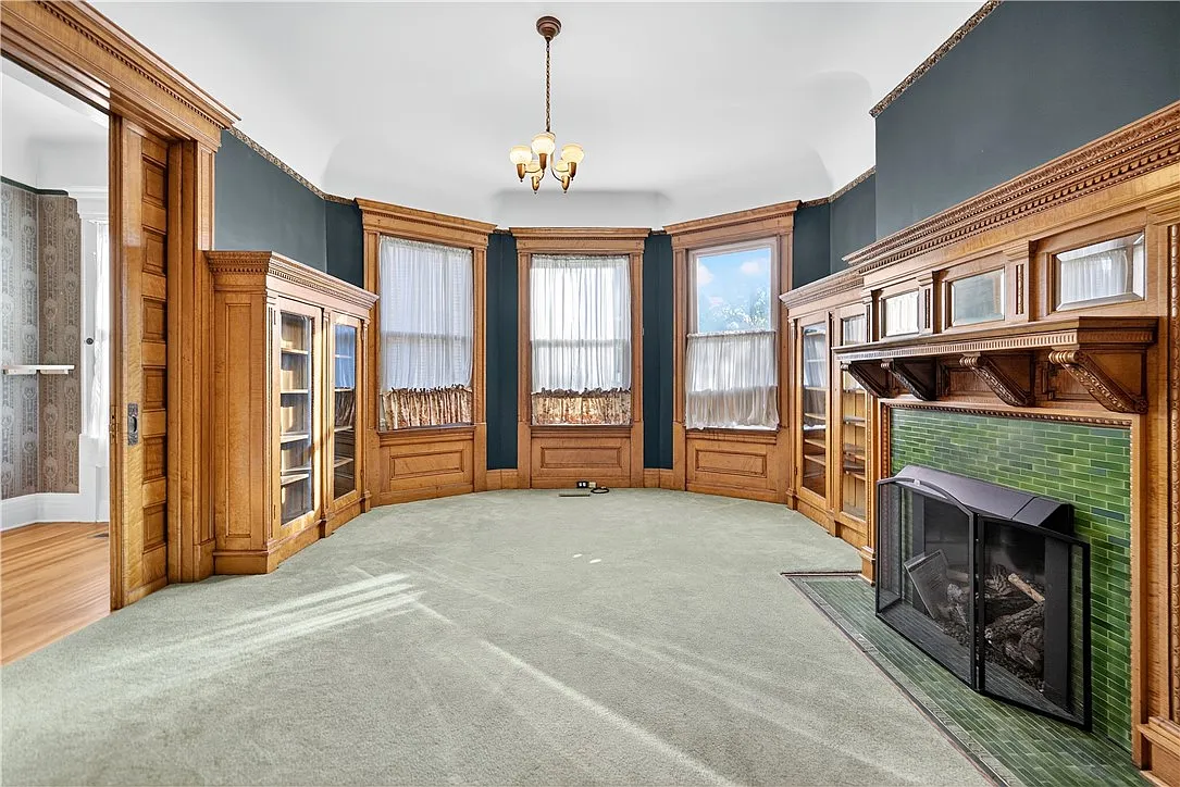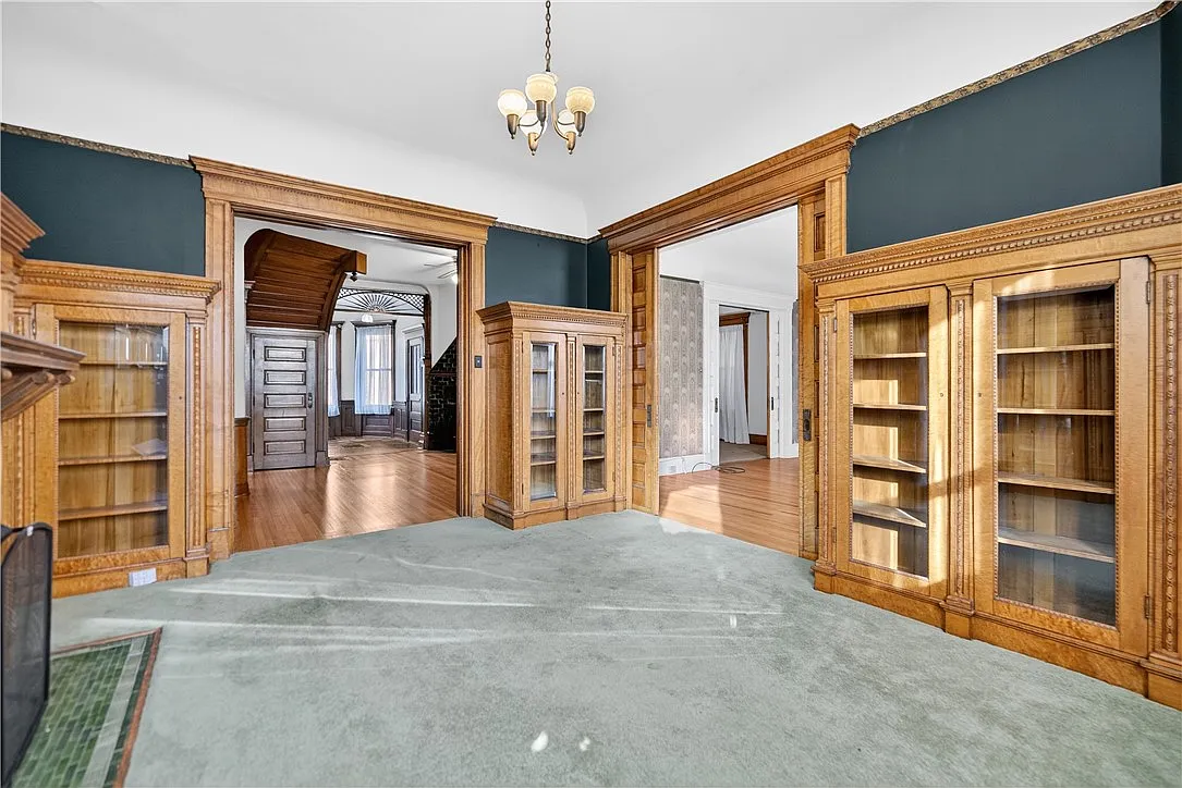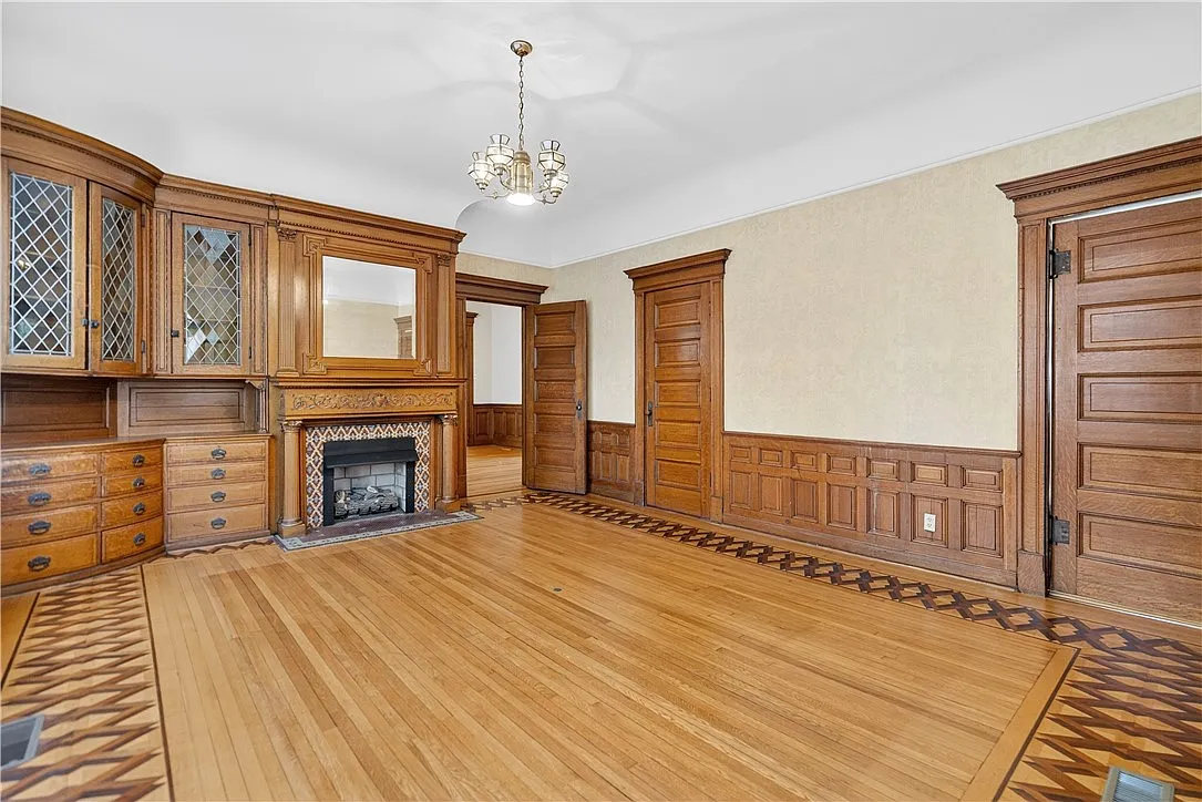 One of the home’s most captivating spaces is the breathtaking dining room, a true showpiece that exemplifies Victorian elegance. Built-in cabinetry lines the walls, offering both beauty and function, while intricate inlaid hardwood flooring underfoot showcases craftsmanship rarely seen today.