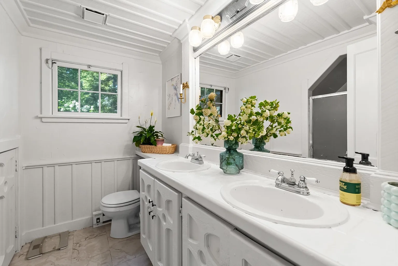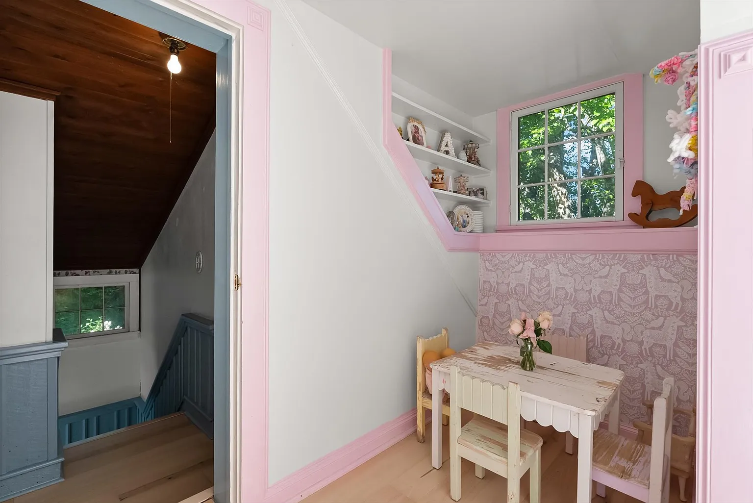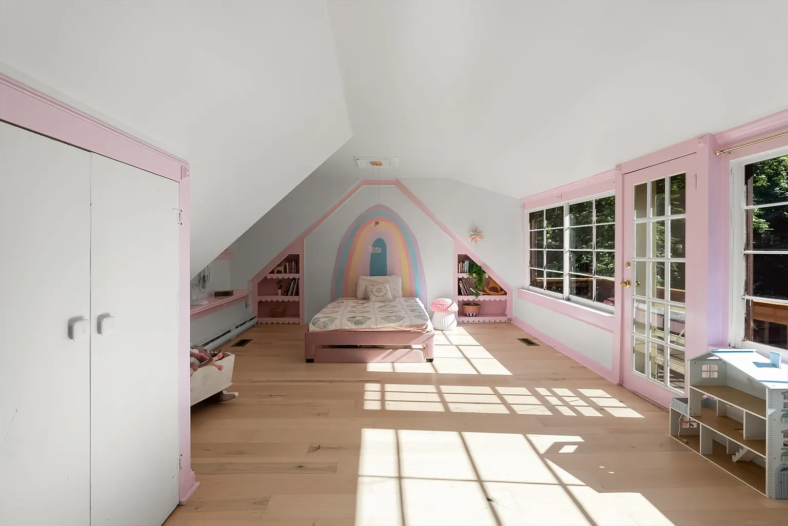 The upstairs bathroom serves both bedrooms and offers a sense of privacy, making the second floor ideal for children, extended family, or visiting friends. Each room maintains the timeless atmosphere of the home—wood textures, cozy lines, and a sense of being tucked into nature—while offering the comfort needed for modern living.