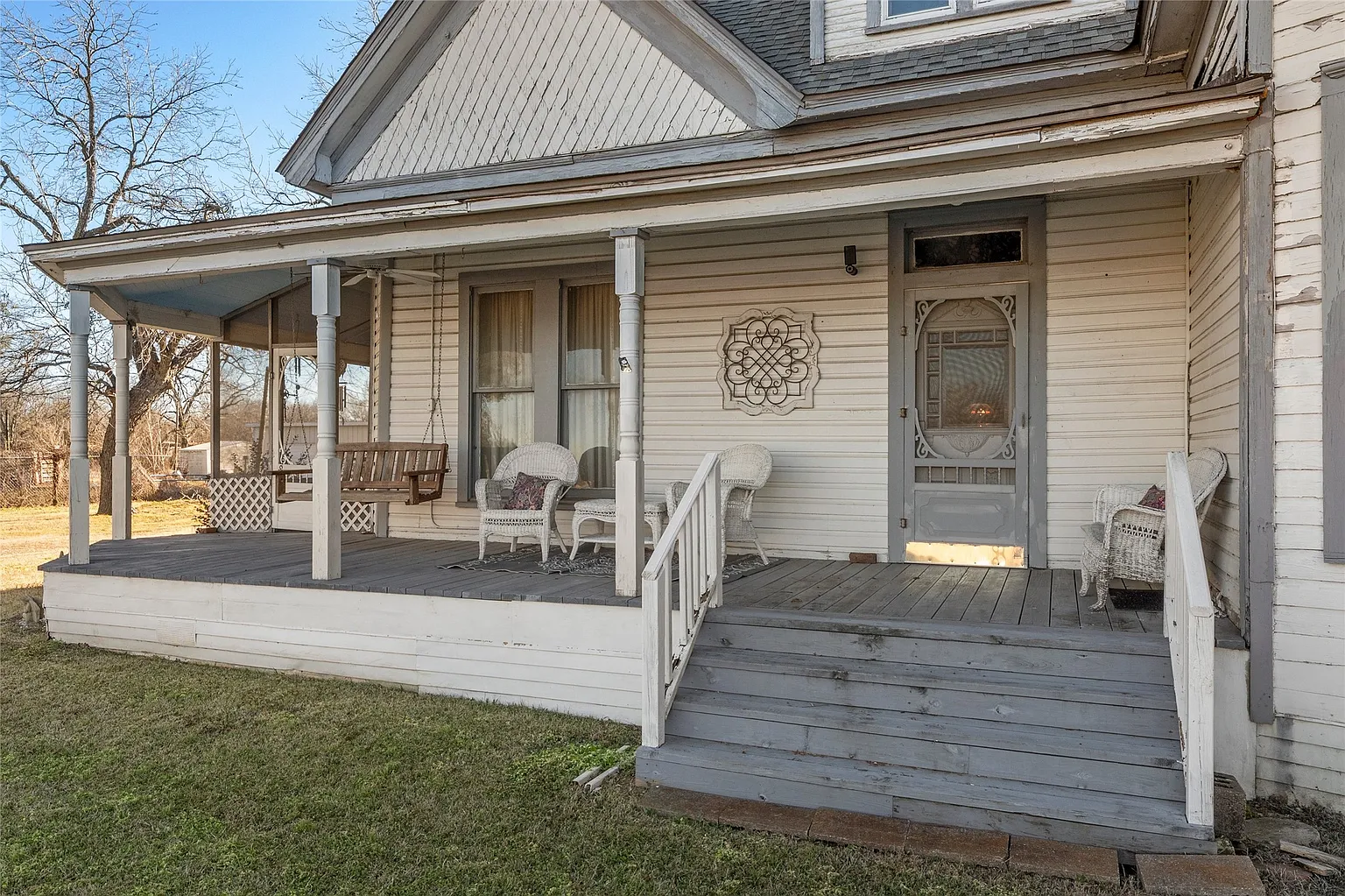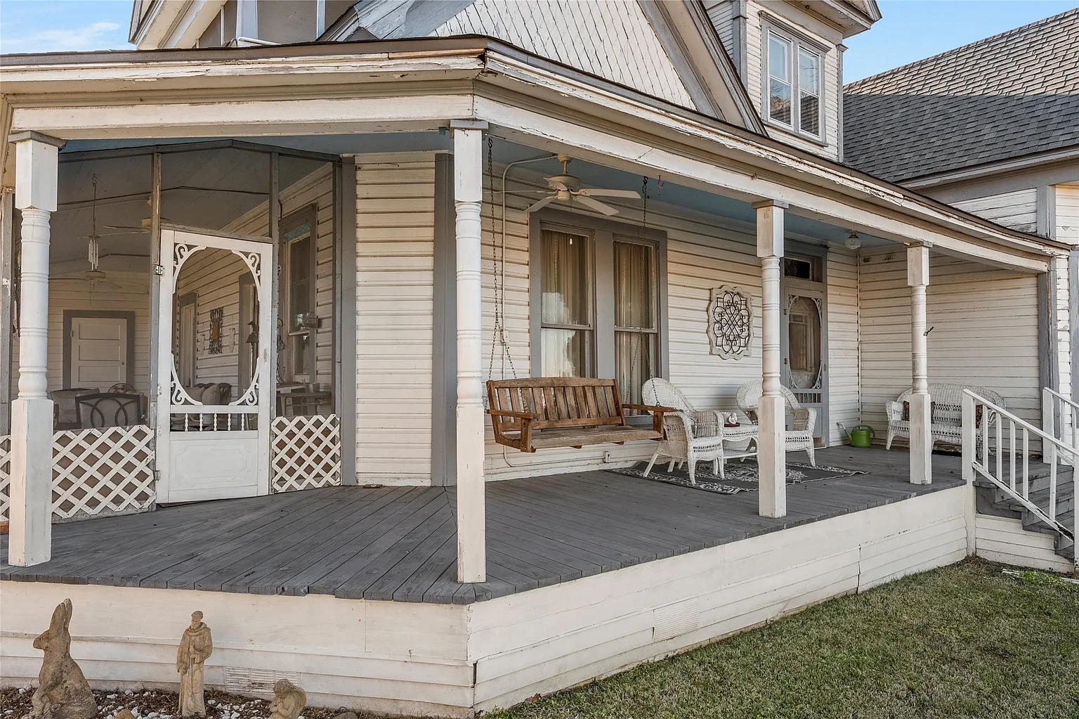 A quaint front porch, complete with a classic porch swing, invites you to pause, sit, and imagine the many conversations and quiet moments that have taken place there over the last century.