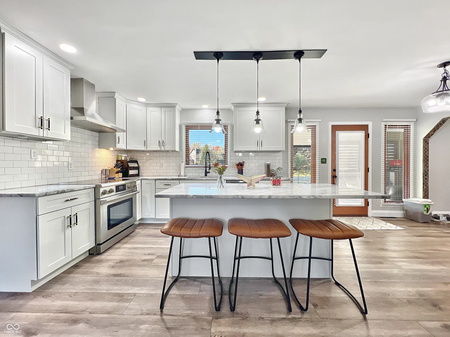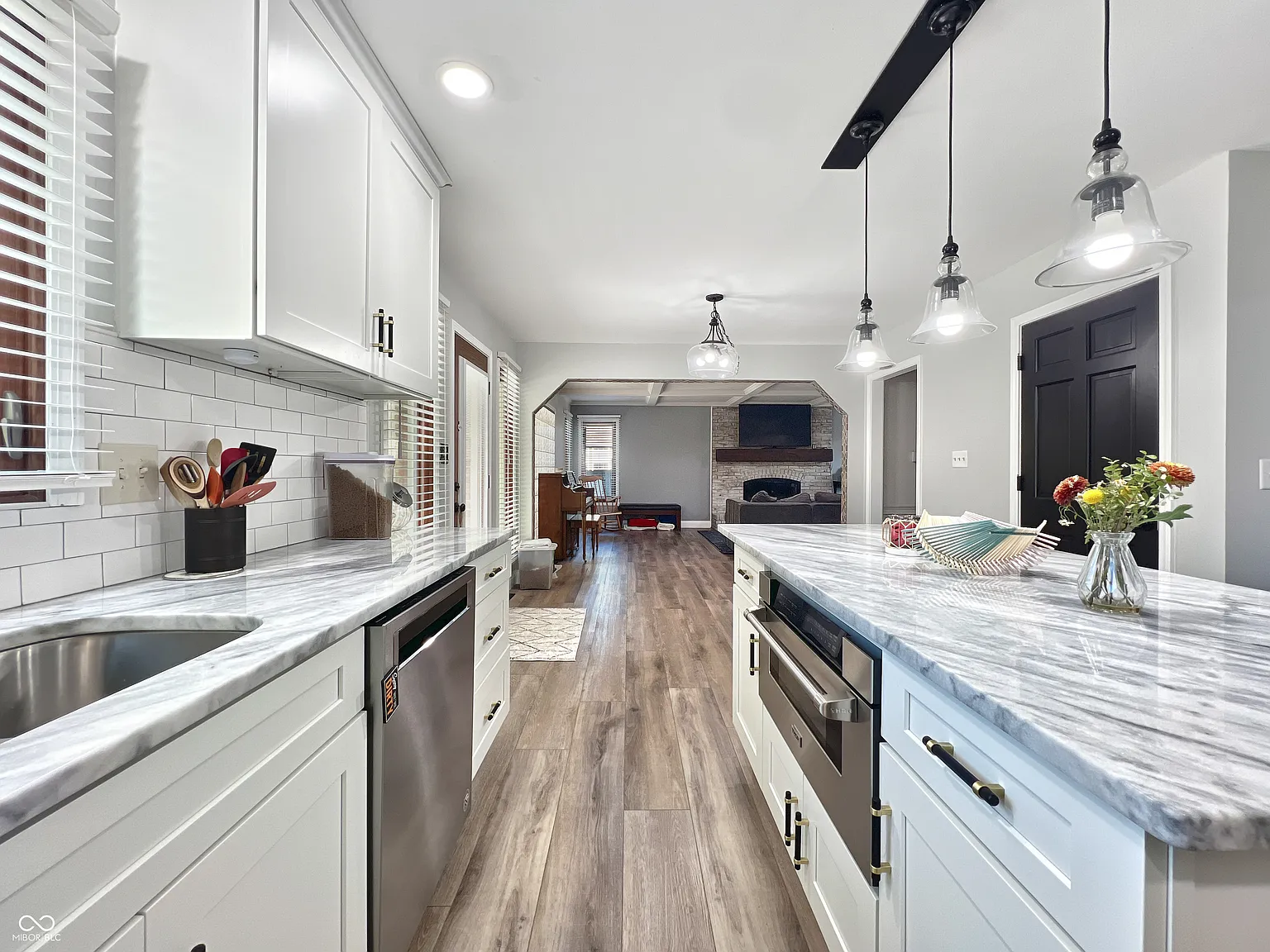 Inside, the home continues to impress with a recently remodeled kitchen—the kind that inspires cooking rather than turning it into a chore. Featuring sleek quartz countertops, soft-close drawers, a large functional center island, and high-end Thor appliances, the kitchen has been designed to serve both everyday meals and holiday gatherings with ease. Its modern functionality pairs beautifully with warm finishes, creating a space that is both elegant and inviting.