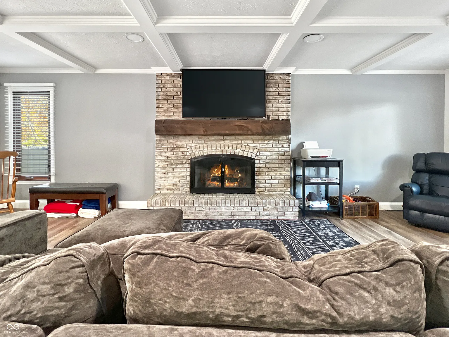 The kitchen opens into a generous, comfortable living room anchored by a fireplace and detailed with handsome coffered ceilings. This shared space feels at once sophisticated and deeply homey, balancing architectural character with effortless livability.