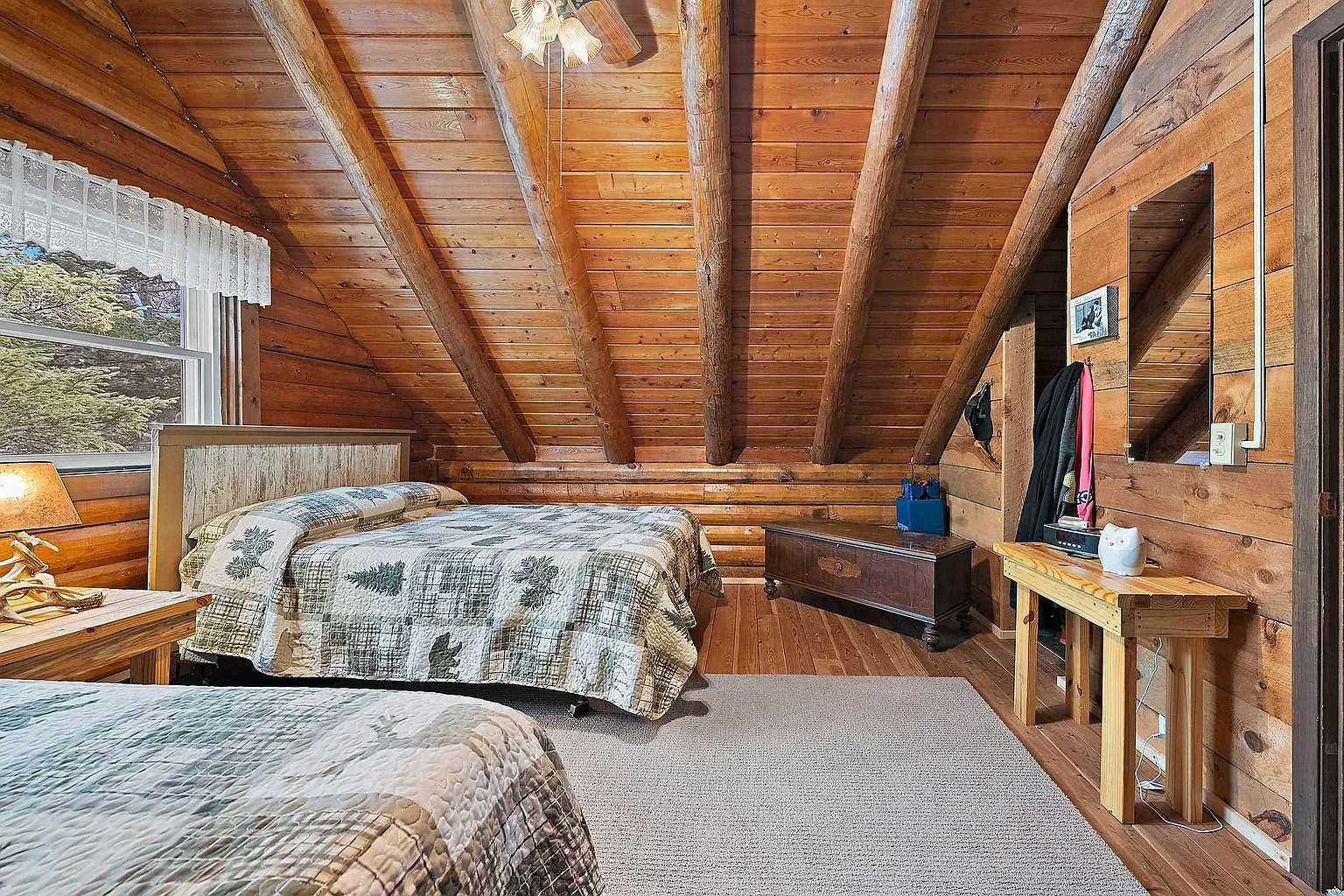 Step inside and you’ll be greeted by an inviting interior that perfectly balances cozy cabin charm with practical living space. Natural wood tones throughout the home enhance the authentic log cabin feel, creating a warm and welcoming atmosphere.