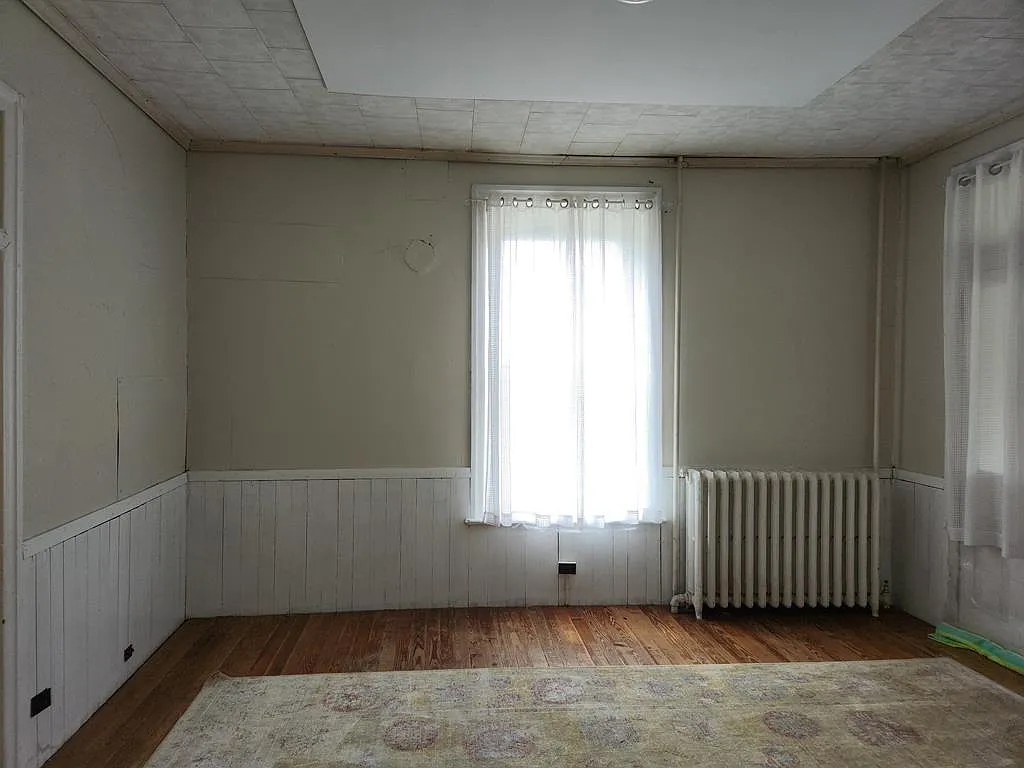 Inside, the home offers four bedrooms and one full bathroom, with spacious rooms that reflect the scale and layout typical of older farmhouses. Tall windows allow natural light to pour in, enhancing the sense of openness throughout the interior.
