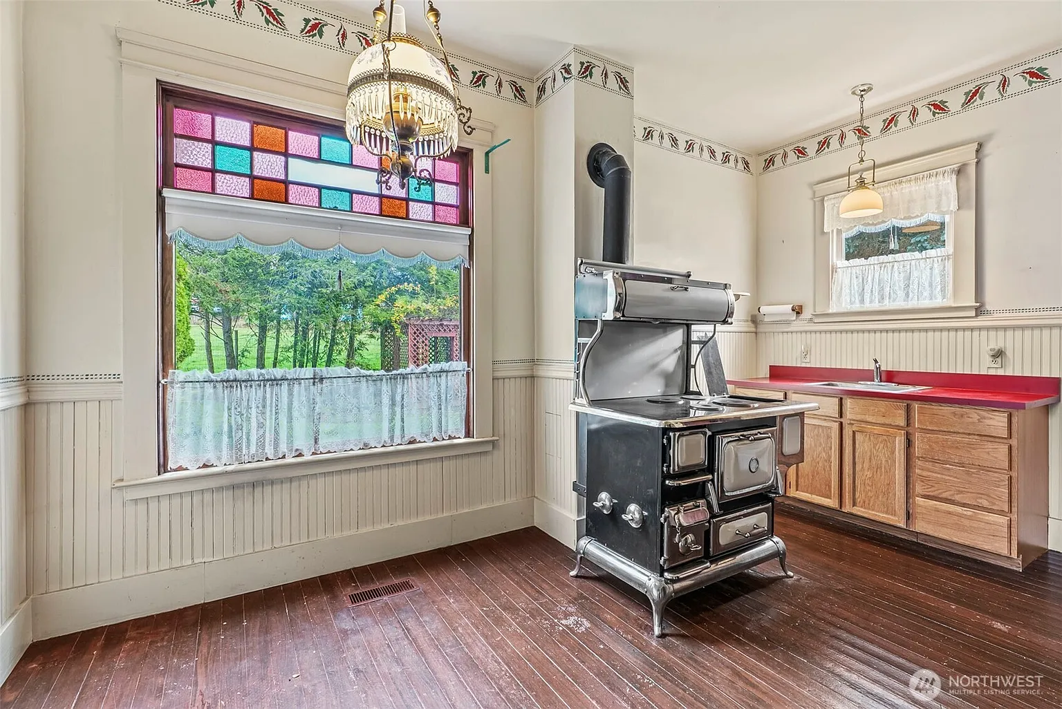 The home showcases a wealth of period-appropriate details, including intricate lighting fixtures, stained glass windows, and a charming built-in buffet that serves as both a functional feature and a conversation piece. These elements reflect the artistry and pride that went into the home’s original construction and its thoughtful restoration.