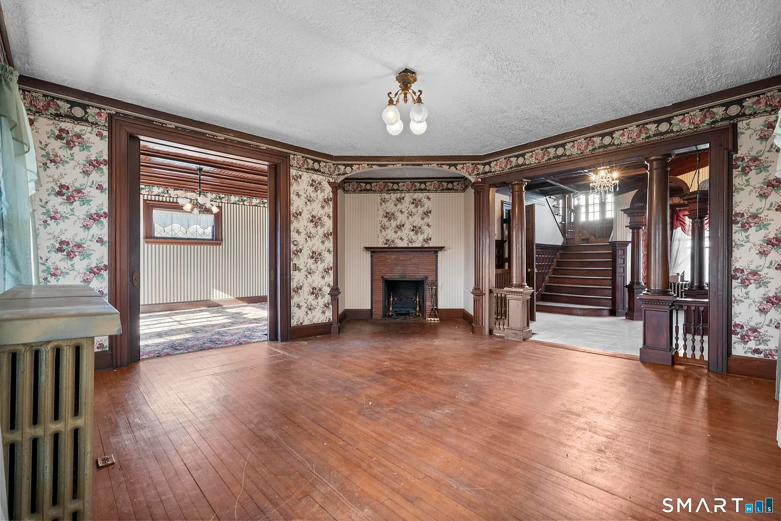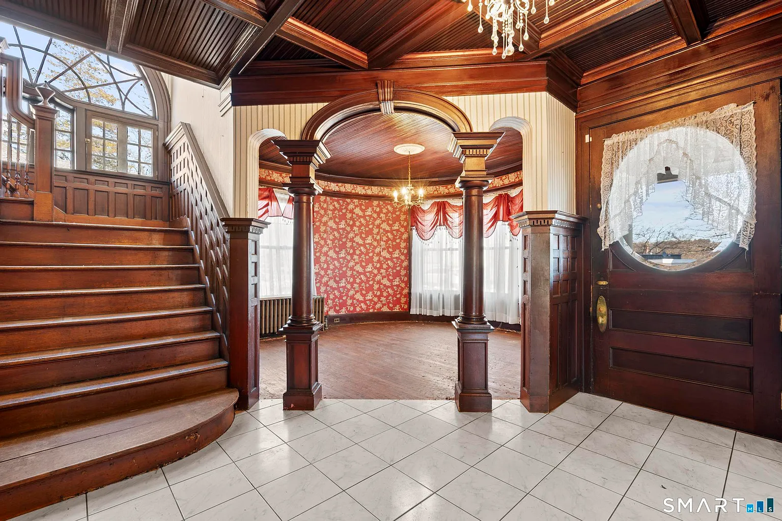 Step inside and you are welcomed by a grand foyer, where a stunning Palladian window bathes the space in natural light. This elegant introduction immediately showcases the home’s attention to detail and historical significance. From the foyer, the layout flows naturally into a truly unique sitting room—perfect for reading, conversation, or quiet reflection.