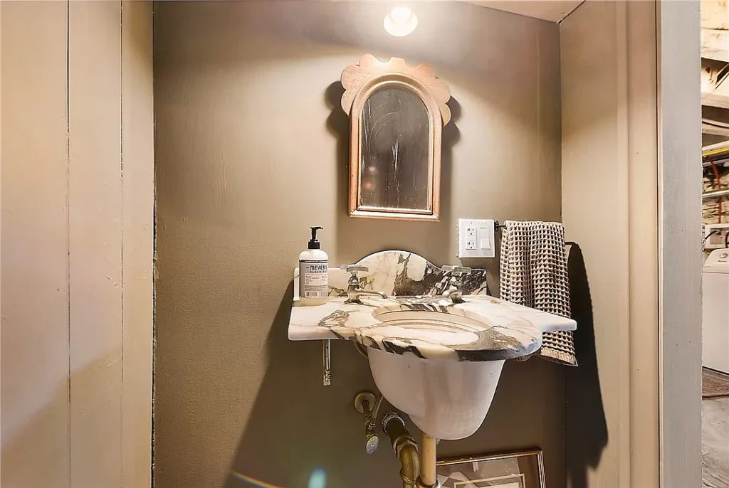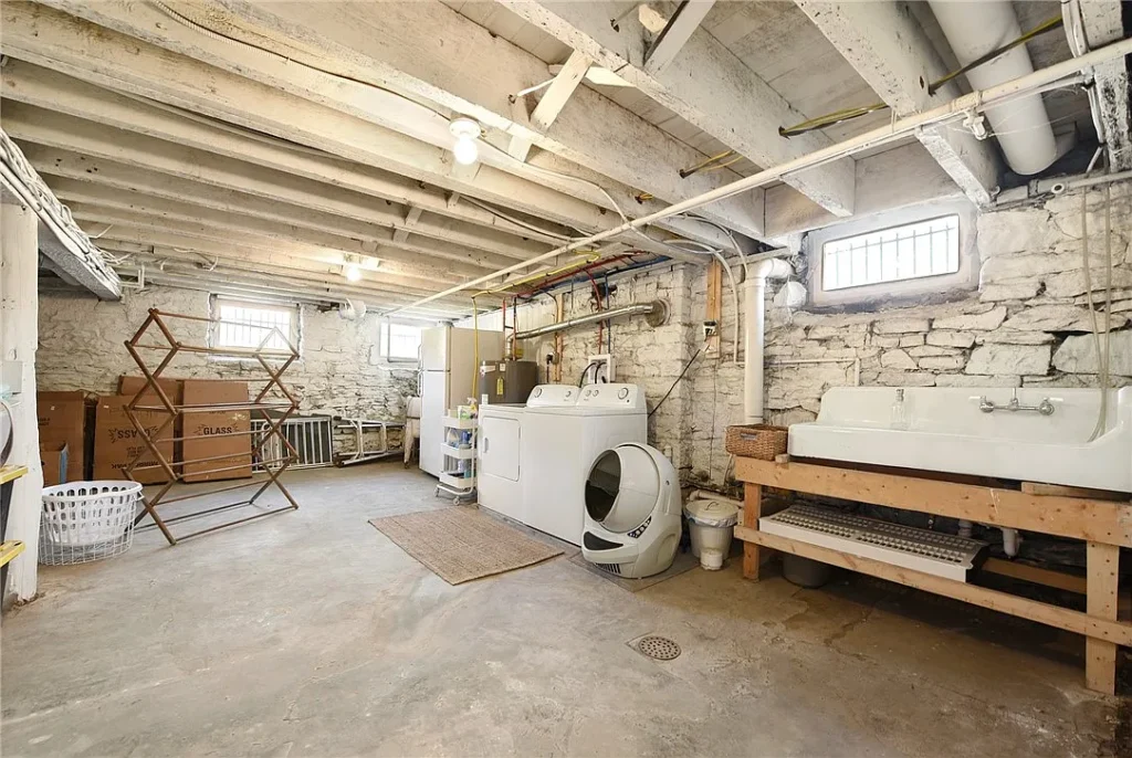 The home’s basement—accessed from the main floor—offers additional square footage that sparks the imagination. With stone foundation walls and a layout that hints at the structure’s age, it can serve as storage, a workshop, a fitness area, or be transformed into something more polished if a future owner chooses. It’s the type of space that invites possibility, and in a historic home, possibility is one of the greatest luxuries.