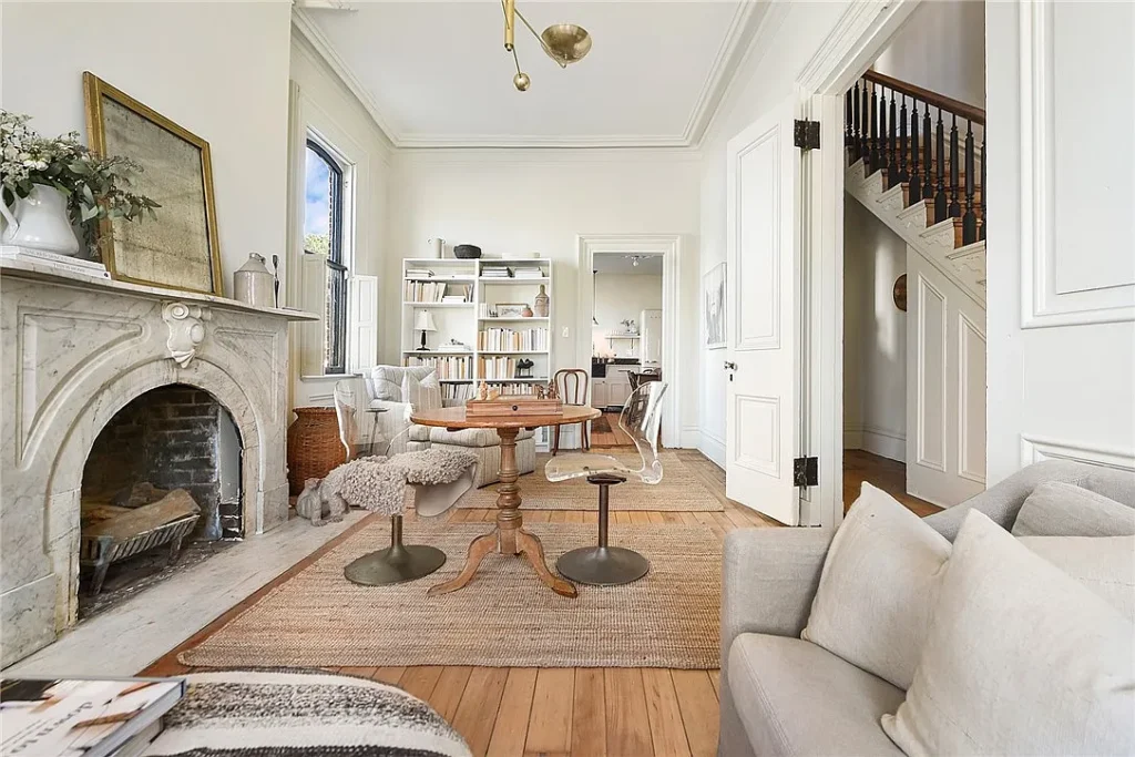 Open the front door and you’re greeted by soaring ceilings that instantly expand the space beyond anything the exterior dimensions might suggest. Tall windows funnel sunlight into the interior, casting warm patterns across hardwood floors that have either been preserved or carefully chosen to reflect the home’s original charm.