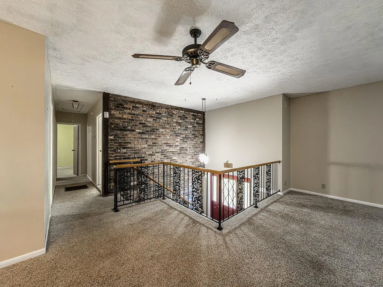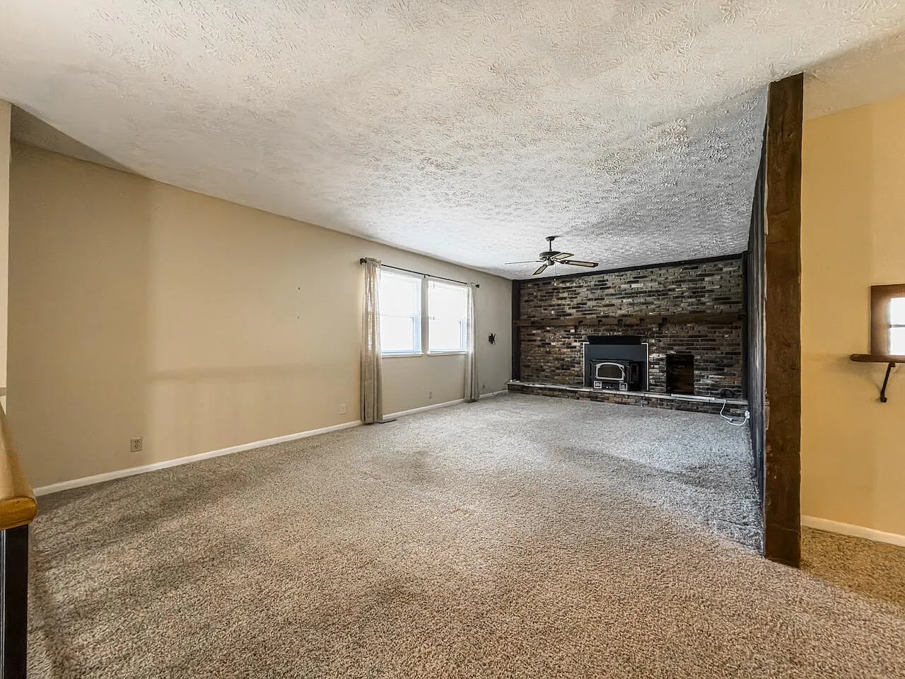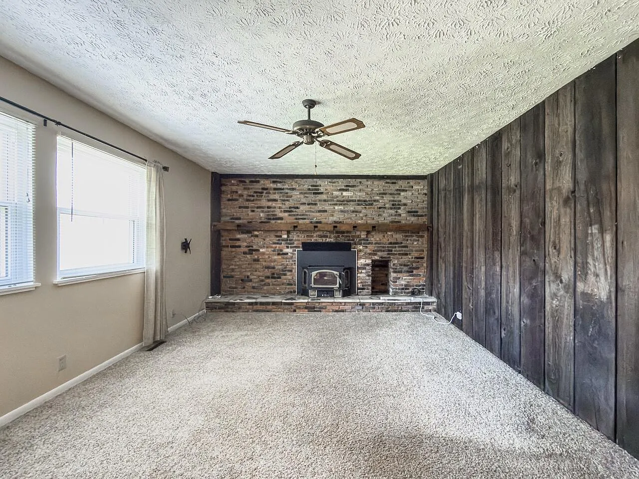 Inside, the home features a spacious living area that serves as the central gathering point. A standout feature is the brick fireplace, complete with a wood-burning stove insert—perfect for cozy evenings during colder months.