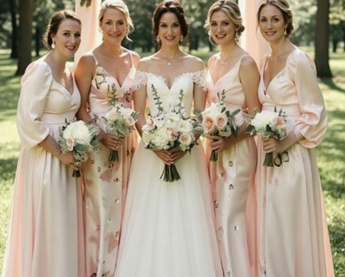 We unzipped the bags, and my heart immediately dropped. The dresses were indeed custom, but they looked like something from a theater costume shop. Shiny satin in an oddly pale peach color, with puffy sleeves and sequins scattered across the bodice. They were flashy in a way that screamed more high school prom than elegant wedding.