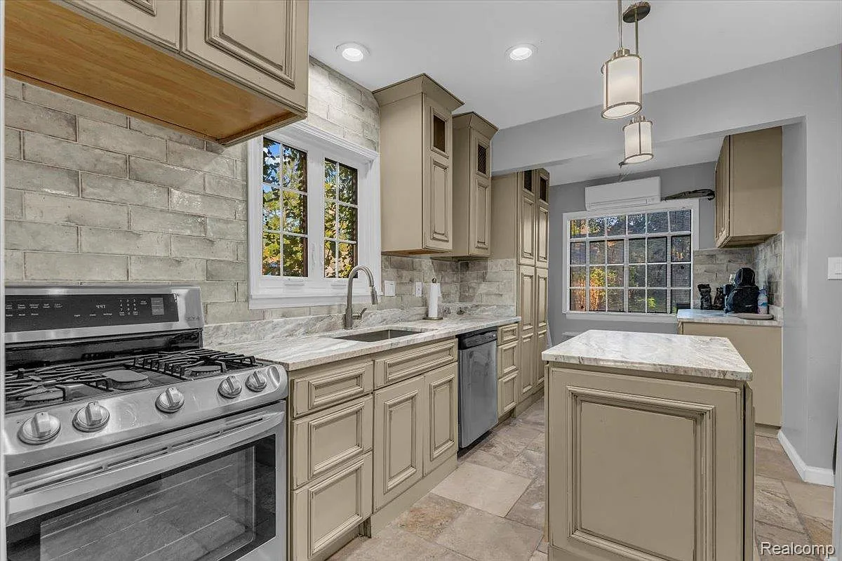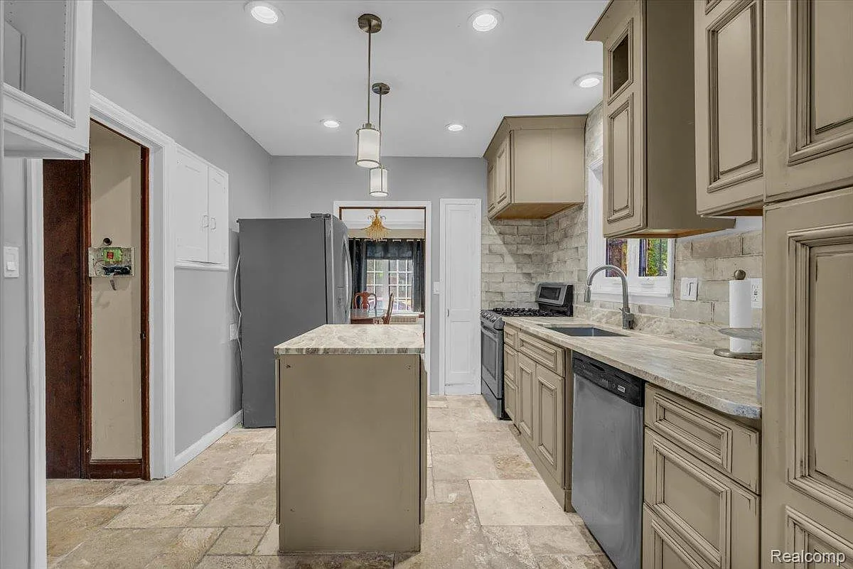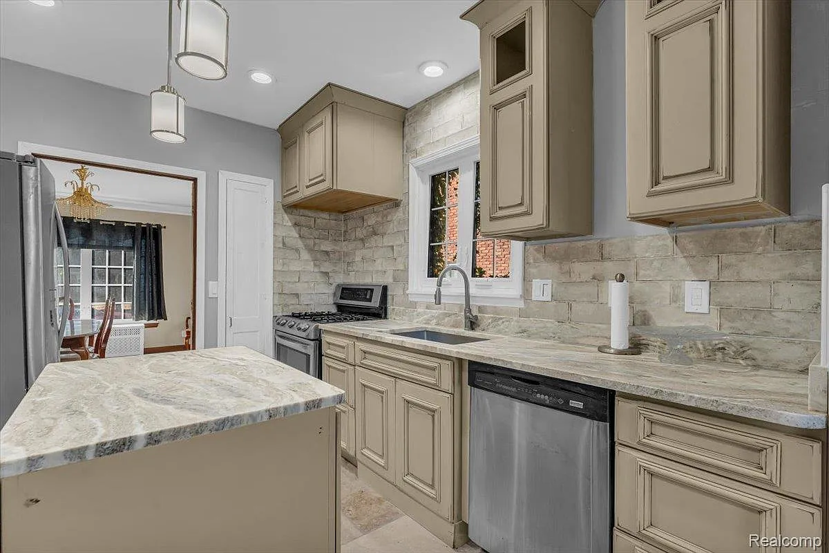 Adjacent to the living room is the updated kitchen, where contemporary finishes complement the home’s traditional layout. Ample counter space, stylish fixtures, and thoughtful design choices make this kitchen a standout for both cooking enthusiasts and entertainers alike.