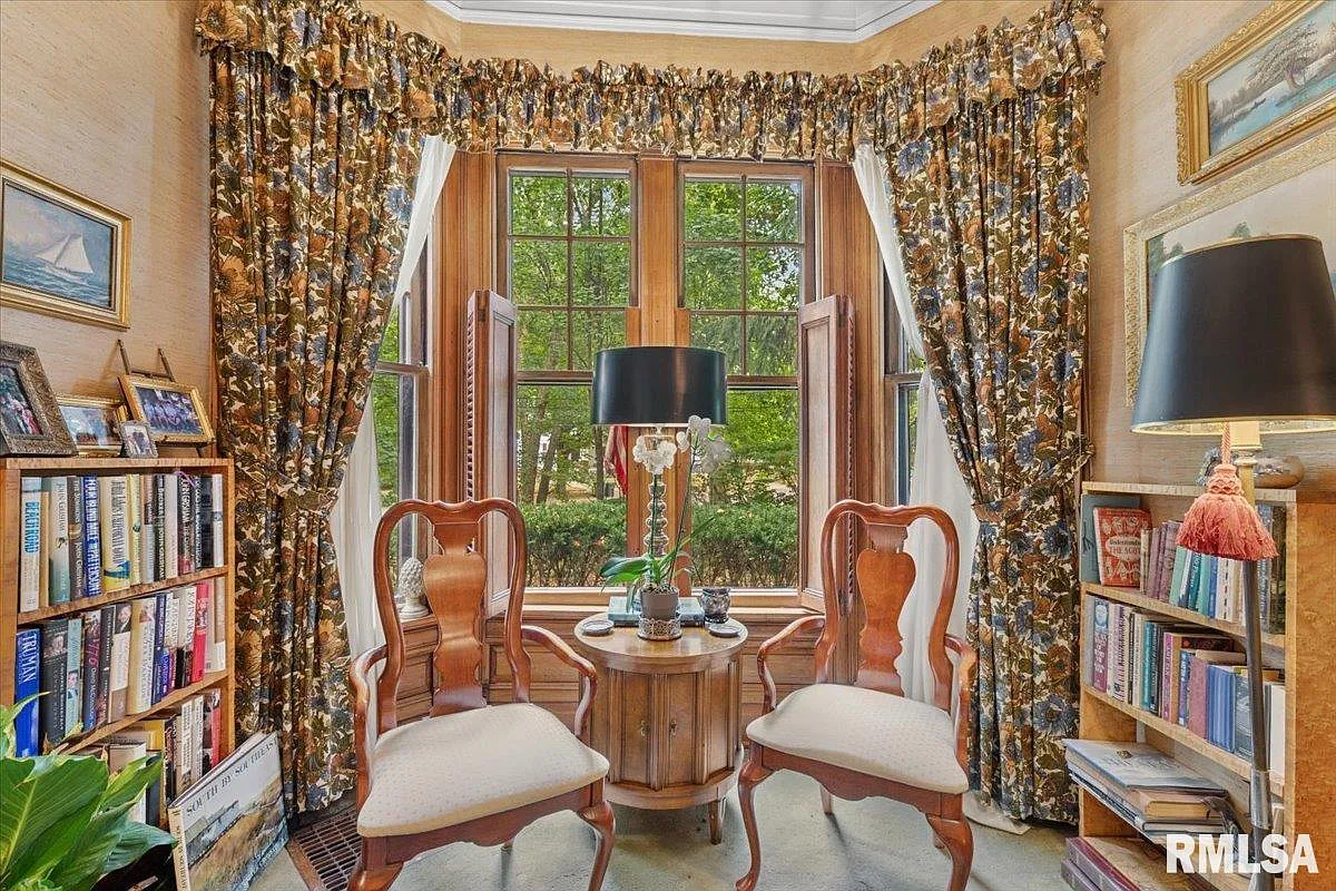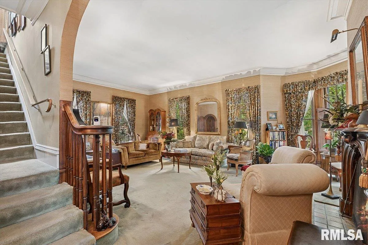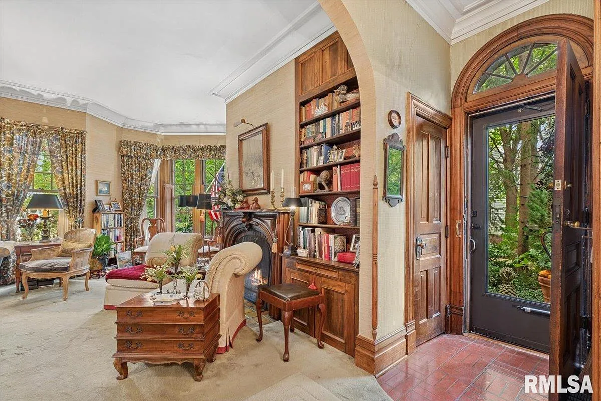 Step inside, and you are immediately greeted by an atmosphere rich in character and warmth. The formal living room is a standout space, showcasing elegant crown molding, built-in bookshelves, and a cozy gas fireplace that serves as the heart of the room.