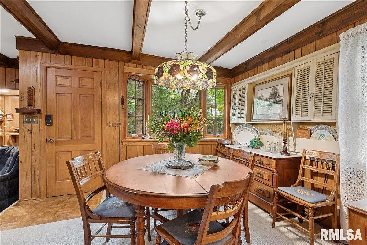 A charming dining area, highlighted by a bay window overlooking the backyard, creates a bright and cheerful spot for casual meals or family discussions. The beamed ceilings add a rustic touch, enhancing the kitchen’s warm and inviting ambiance.
