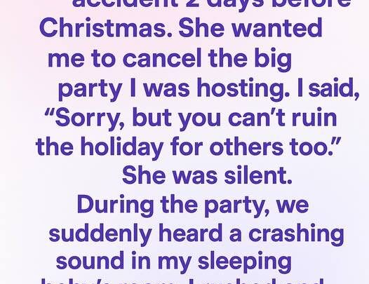 Hours passed, and the party continued around us. Glasses clinked, holiday music drifted through the air, and wrapping paper rustled as children opened early gifts. Then, out of nowhere, a loud crash echoed from upstairs — from my sleeping baby’s room. My heart jumped. I didn’t think. I ran. My guests froze, and my sister disappeared from her seat.