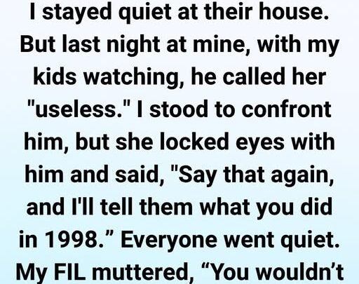 My father-in-law had always been the kind of man who thought sarcasm made him funny. At every family gathering, he’d make comments about my mother-in-law — little “jokes” about her cooking, her memory, or how she “couldn’t do anything right.” Everyone laughed awkwardly, pretending not to notice how uncomfortable she looked. My husband would change the subject, the kids would fidget, and I would sit there, biting my tongue.