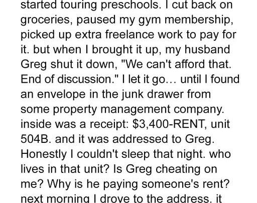 I was cleaning the kitchen and organizing a drawer filled with old receipts, spare batteries, and random papers. Buried at the bottom was a neatly folded envelope addressed to Greg from a property management company. I almost threw it out, assuming it was junk mail, but curiosity stopped me. Inside was a receipt—$3,400 for monthly rent on a luxury apartment downtown.