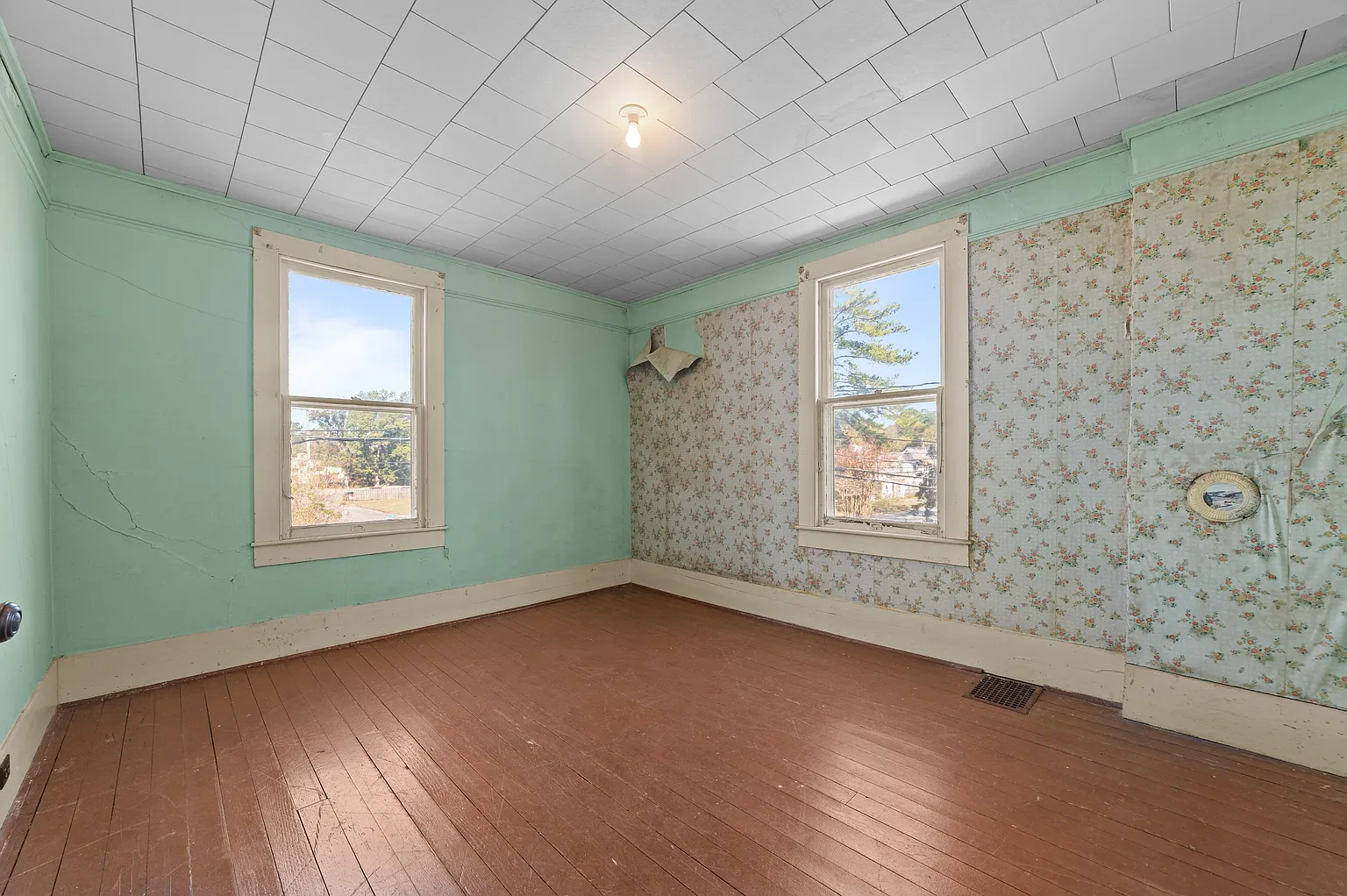 A distinctive punched tin ceiling in one of the upstairs bedrooms