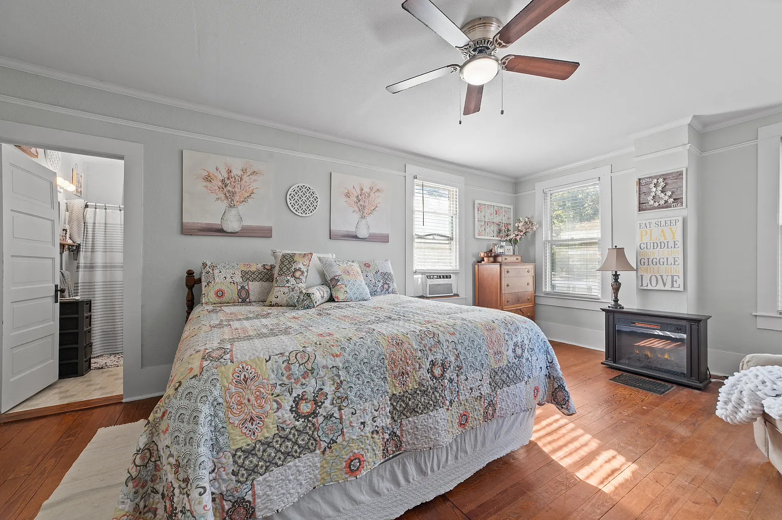 These details offer warmth and authenticity that define historic homes. The preservation of plaster walls on both floors speaks to the care taken to maintain the property’s structural and aesthetic integrity. Rather than stripping away its past, the previous owners embraced and protected it.