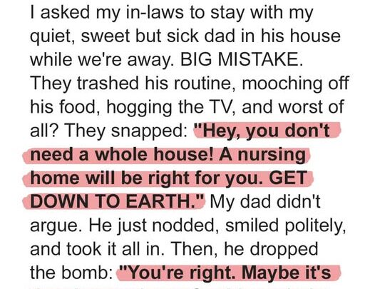 When my husband and I planned a short trip, I asked my in-laws to stay with my dad. He’s a quiet, gentle man — not sick, just needing some company and a helping hand. I thought it would be a simple arrangement: a week of shared meals, light conversation, maybe a few TV nights together. My father’s home is calm and peaceful, a place where time moves slowly and kindness fills the air.