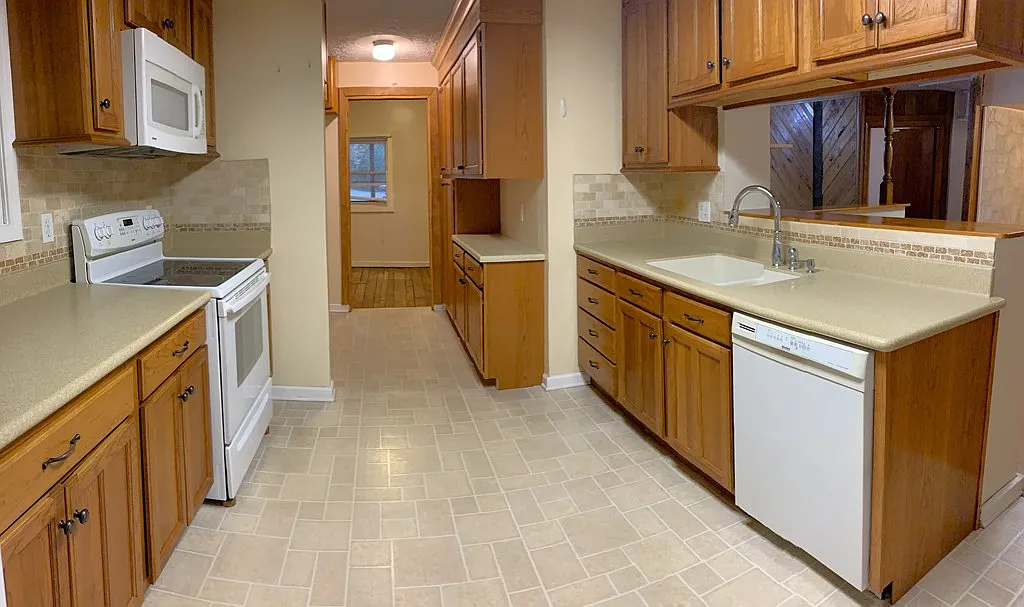 The heart of the home is the updated kitchen, which boasts solid wood cabinetry that brings warmth and durability to the space. Solid surface countertops provide an easy-to-maintain and stylish workspace for cooking, baking, and entertaining. All kitchen appliances are included, making the home move-in ready for its next owners.