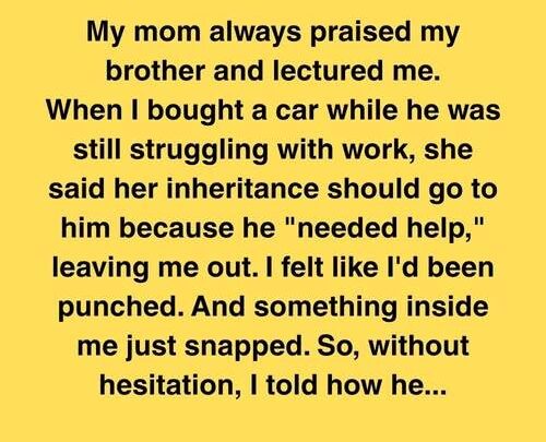 When I bought a car while he was still struggling with work, she said her inheritance should go to him because he “needed help,” leaving me out. I felt like I’d been punched. And something inside me just snapped. So, without hesitation, I told how he stole from me—twice—and lied straight to my face about it.