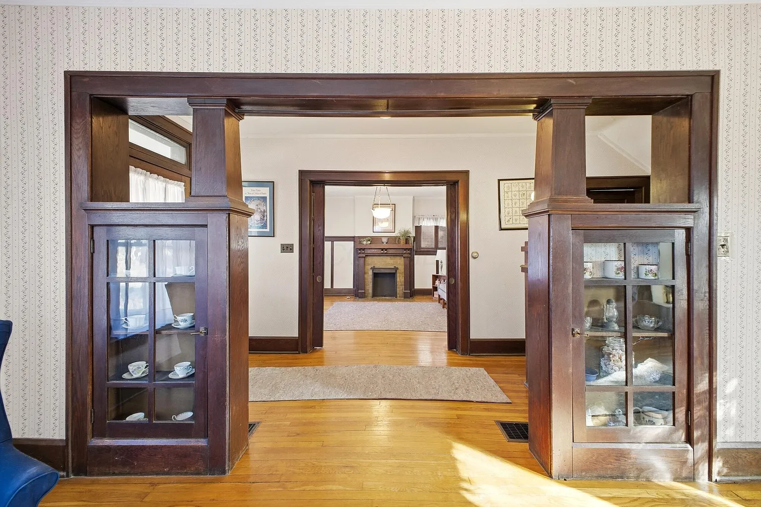 Inside, the home delivers on its promise of historic character. Original hardwood floors, extensive woodwork, library-style doors, and tall ceilings immediately set the tone. Large windows throughout the house flood the interior with natural light, emphasizing the scale of the rooms and highlighting the craftsmanship that defines the property.