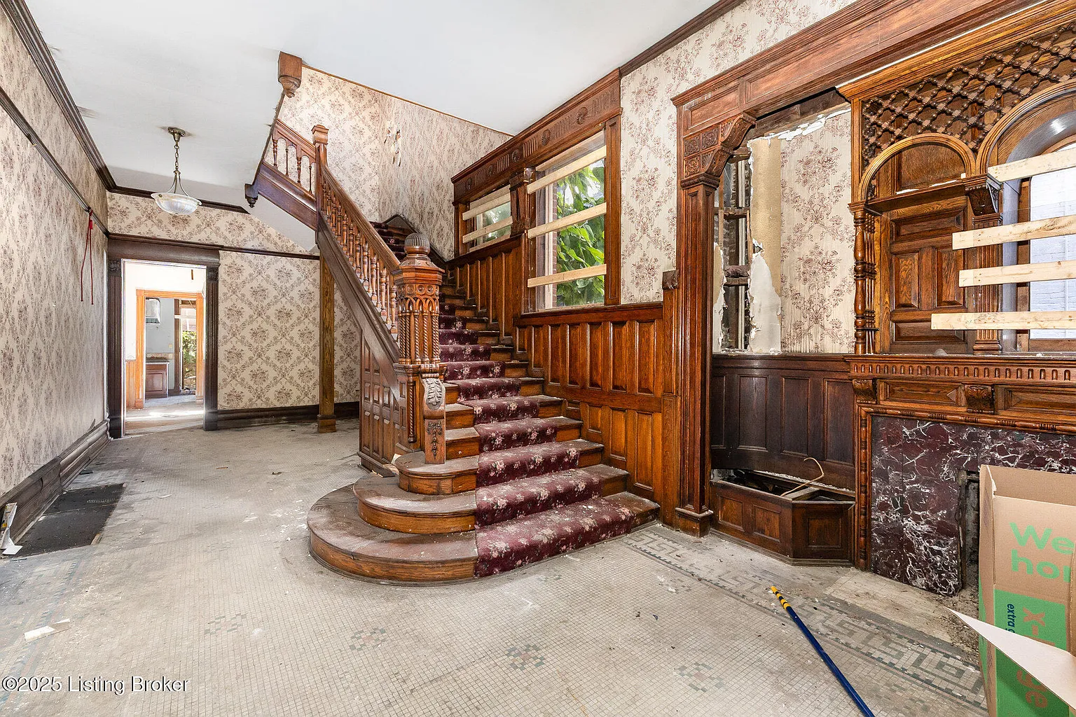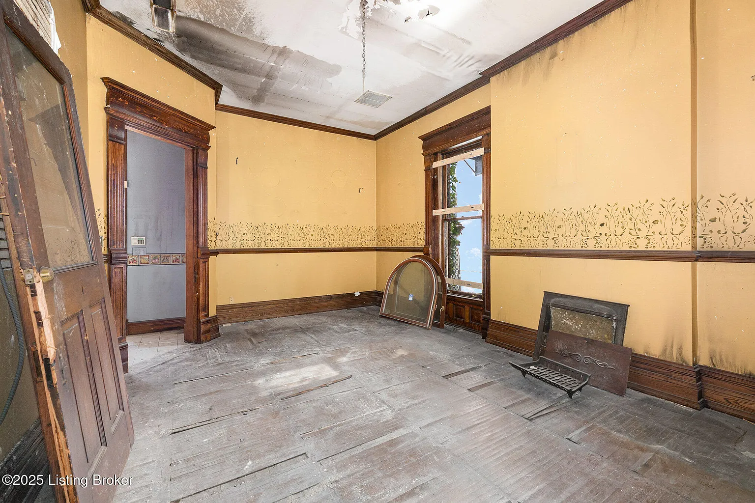 The home’s bones speak to its grand past: soaring ceilings, intricate millwork, detailed trim, and expansive rooms designed to impress. These architectural elements provide a rich foundation for restoration.