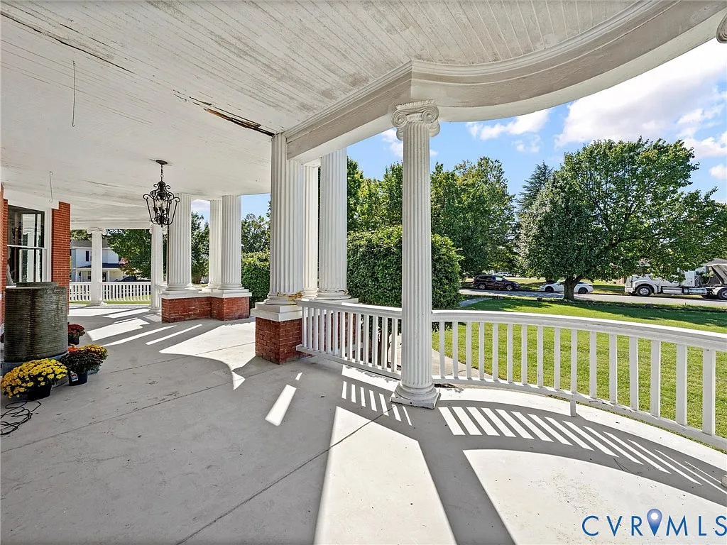 The porch is framed by steel columns imported from England, a rare and striking detail that speaks to the ambition and craftsmanship behind the home’s construction. Whether enjoyed with morning coffee or evening conversation, this porch offers a front-row seat to the quiet charm of small-town Virginia living.