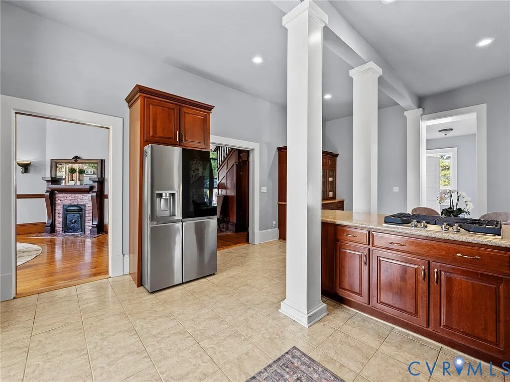 Adding warmth and character throughout the home are six fireplaces, each adorned with beautiful mantles and distinctive tile work. These fireplaces provide a reminder of the home’s historic roots while creating inviting gathering spaces during cooler months.