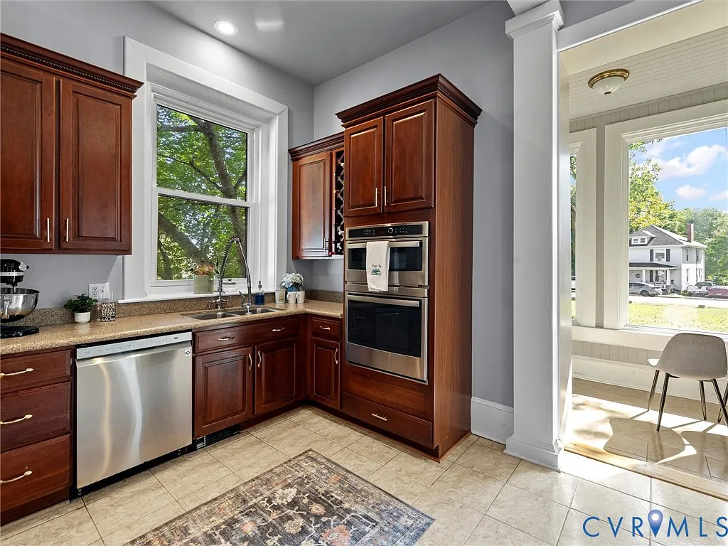 The kitchen balances historic charm with modern convenience. It is equipped with granite countertops, cherry cabinetry, and newer stainless steel appliances, making it both attractive and functional. This space supports everything from casual breakfasts to large-scale entertaining, seamlessly blending old-world character with contemporary efficiency.