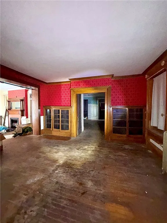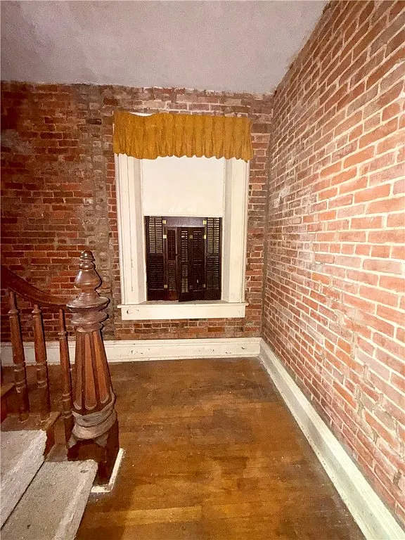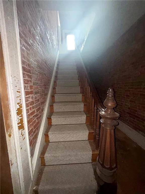 Stepping through the entry, visitors are greeted by a striking brick parlor featuring original double doors that open toward the grand main staircase. This architectural focal point sets the tone for the rest of the interior.