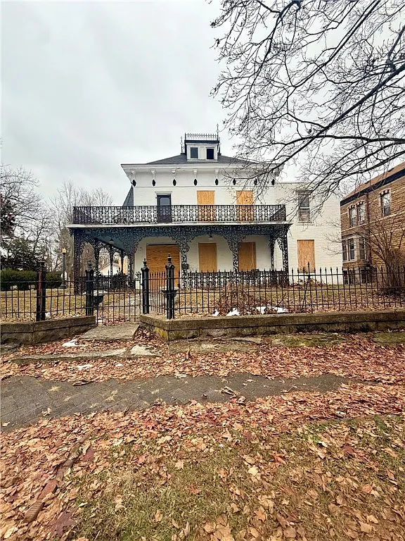 From the moment one approaches the home, its historic presence is unmistakable. A brick driveway leads to the property, framed by a black iron fenced front yard with gated entry. Ornate wrought-iron porch railings add decorative elegance, complementing the home’s solid brick façade.