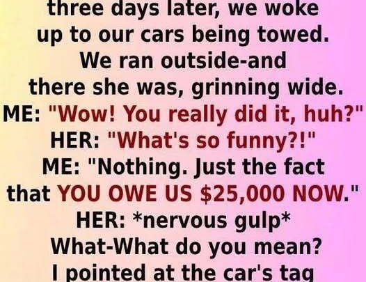 The tow truck drivers quickly unhooked our cars, apologized, and drove off. Our neighbor stood frozen on the curb, staring at the ground. She muttered something under her breath and hurried inside, slamming the door behind her.