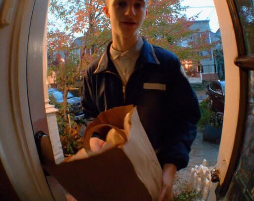 I pulled the door open, and a young man in a delivery uniform stood there, balancing a large paper bag of takeout in one hand and his phone in the other.