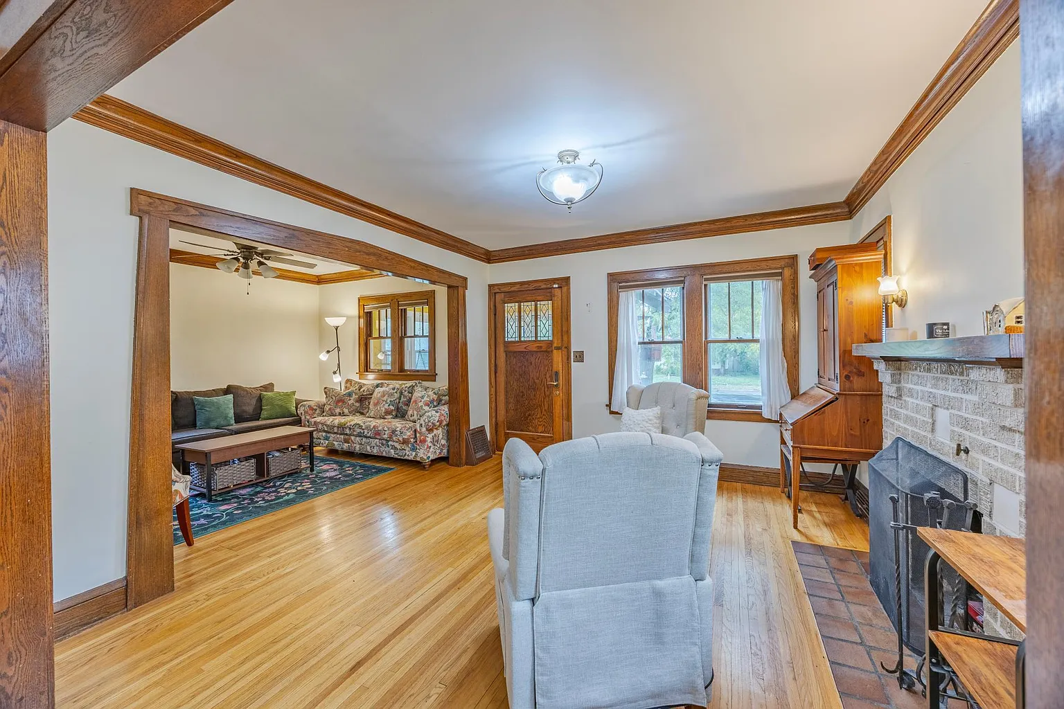 The living room serves as a central gathering space, anchored by a fireplace that brings charm and comfort during Minnesota’s cooler months. Built-in bookcases add architectural interest while also providing practical storage and display space.