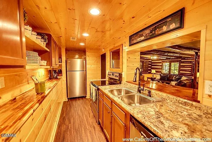 The cabin comes fully furnished, allowing for a seamless transition for new owners or investors. Every detail has been thoughtfully selected to complement the rustic theme while ensuring comfort and functionality. From seating arrangements to bedroom furnishings, everything is in place to welcome guests immediately.