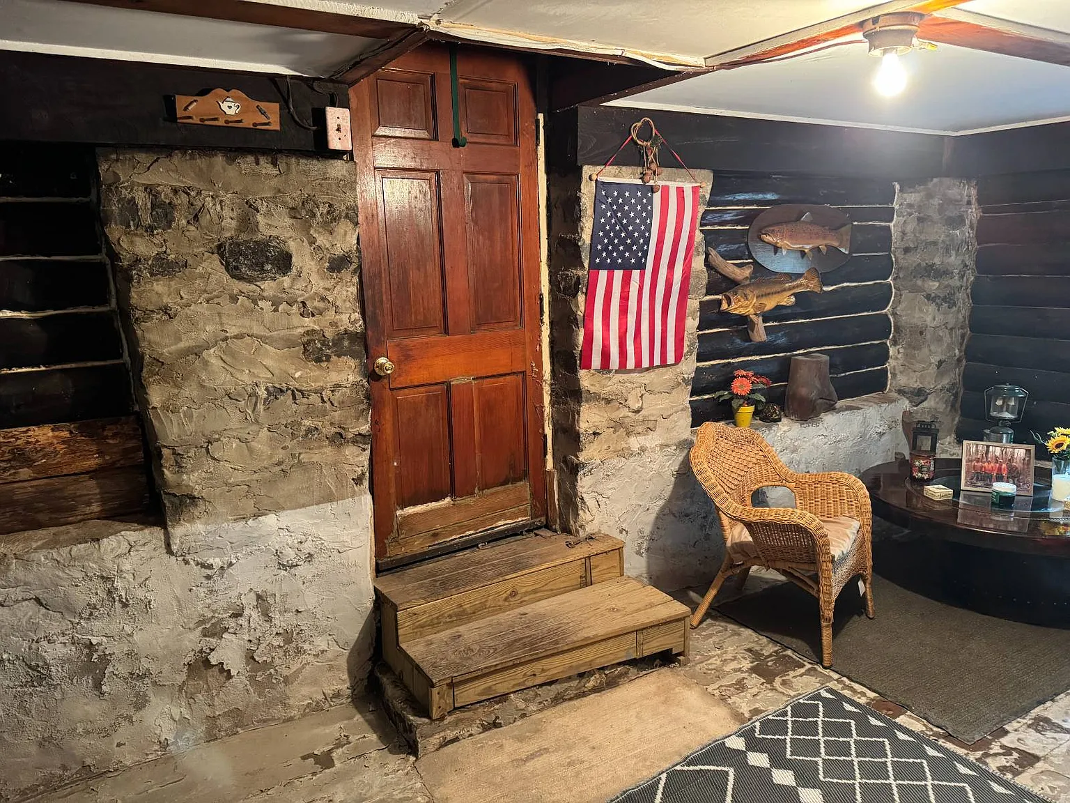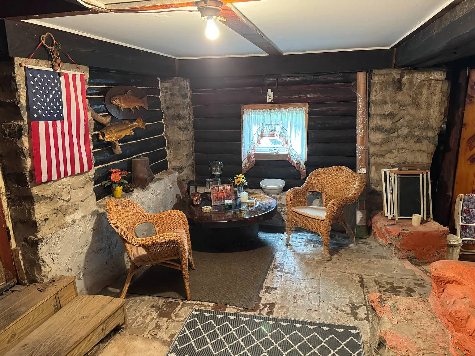 What makes this cabin especially distinctive is its construction. Built using stones and logs sourced directly from the land itself, the structure blends organically into its surroundings.