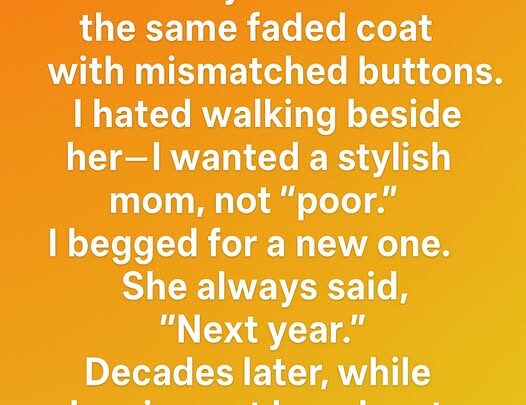As a teenager, I used to roll my eyes every winter when my mom pulled out her same old coat. It was faded from years of wear, and some of the buttons didn’t even match anymore. I hated walking beside her in public. I wanted a stylish mom, one who looked like the other mothers—polished, confident, not “poor.” I remember begging her more than once to buy a new one. Every time, she would smile gently and say, “Next year, sweetheart.”