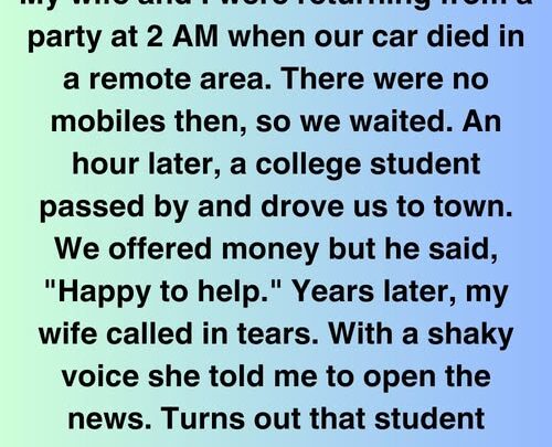 Over the years, my wife and I spoke often about that night. It wasn’t just the fact that he stopped—it was how he did it. Without judgment, without hesitation. In a world that can often feel cold and indifferent, he had reminded us what simple, human kindness looks like.