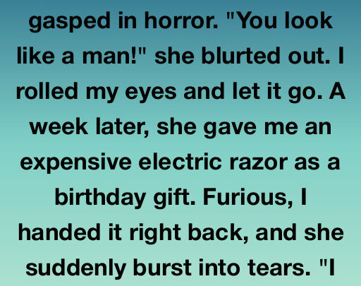 A week later, my birthday arrived, and the annual family dinner was predictably stressful. After the cake, when it came time for presents, Mom handed me a neatly wrapped, heavy box. I opened it to find a brand-new, expensive electric razor—the kind marketed specifically for men’s faces and rugged hair growth. It was sleek, professional, and entirely out of place among the usual scented candles and gift cards.
