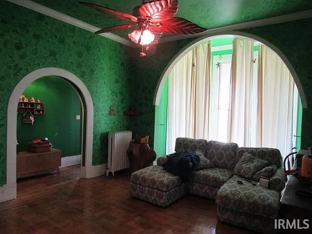 Stepping inside, the home continues to impress with an abundance of original architectural details. Elevated ceilings enhance the sense of space throughout the main level, while built-in arched accents add a distinctive visual character.