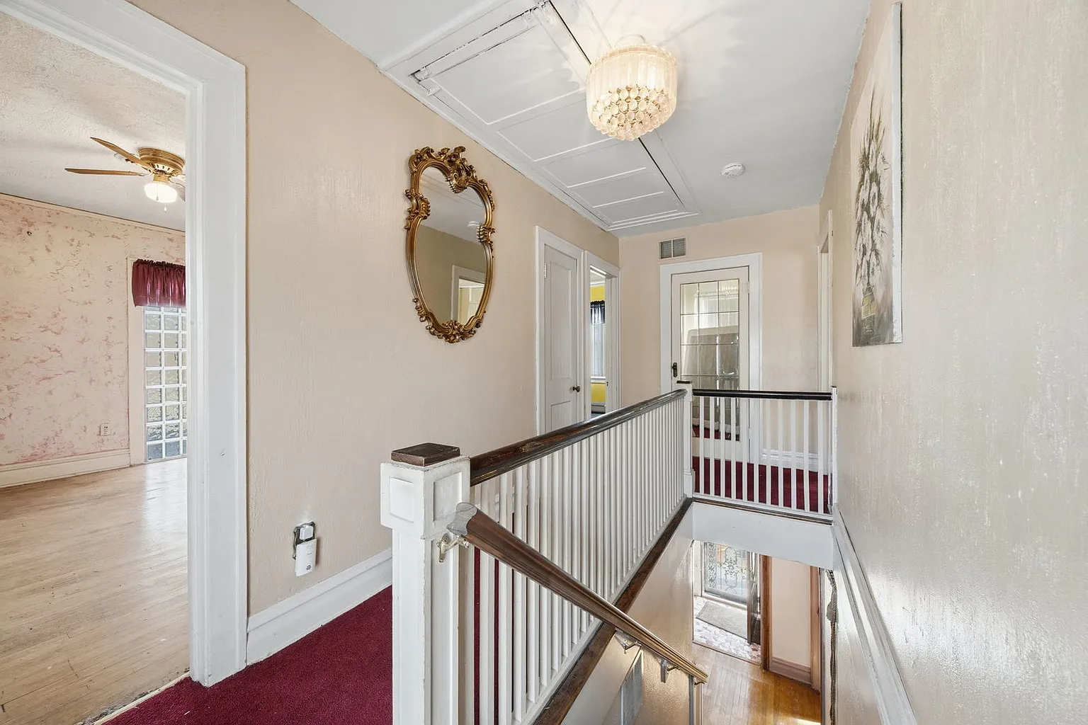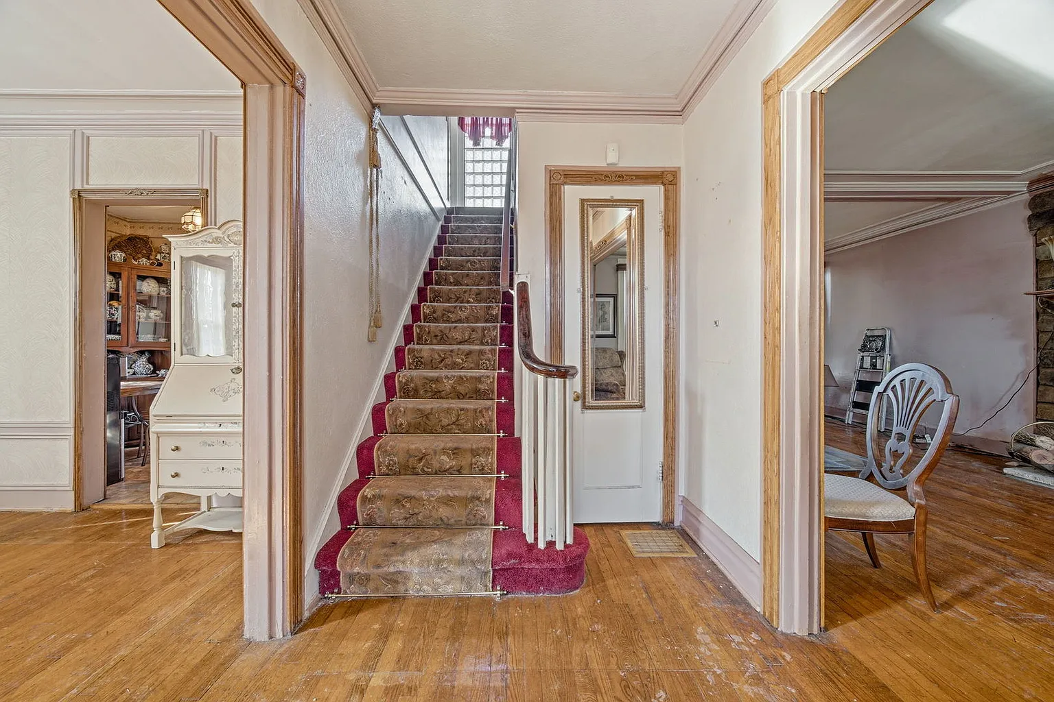 One of the most striking features throughout the home is the original hardwood flooring. These floors tell a story of durability and timeless style, providing a rich foundation that complements the home’s architectural details.