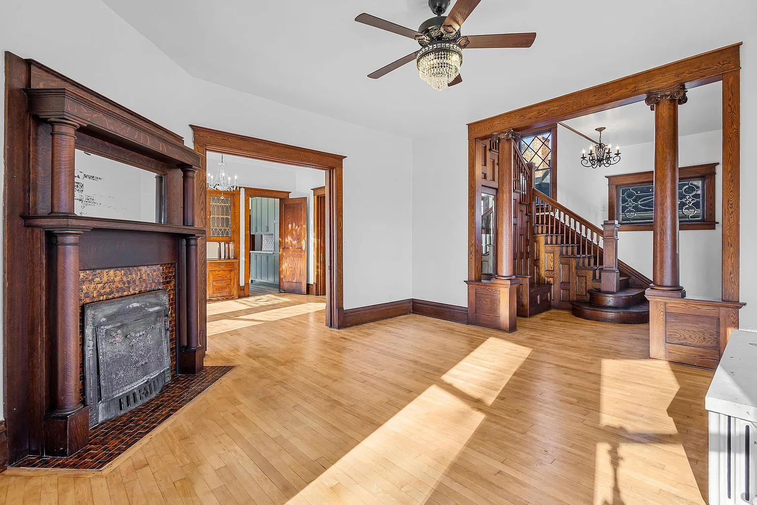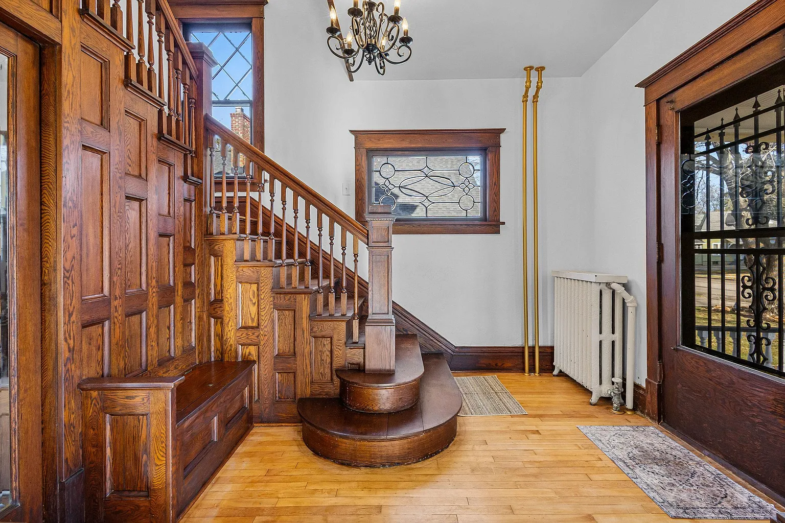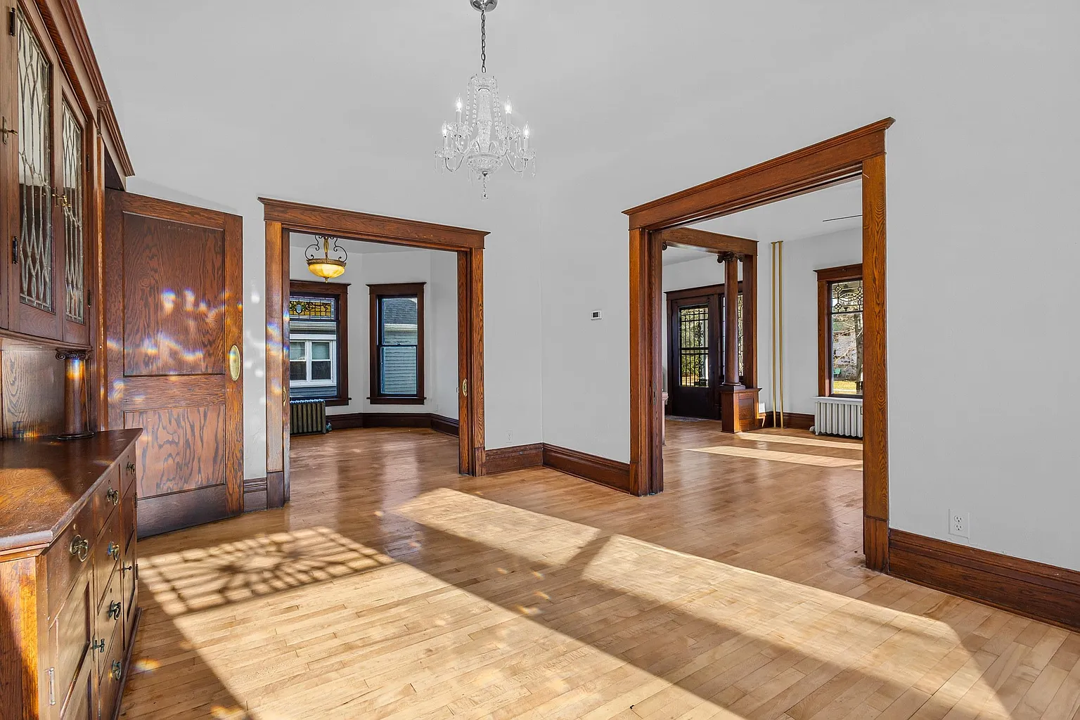 Hardwood floors, solid wood doors, and elegant vintage chandeliers further enhance the home’s historic charm, creating a cohesive and refined interior.